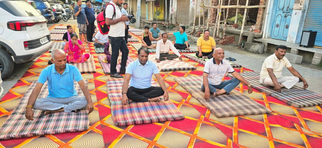 नगर मे जगह जगह मैदानों, घरों में लोगों ने किया योग-प्राणायाम