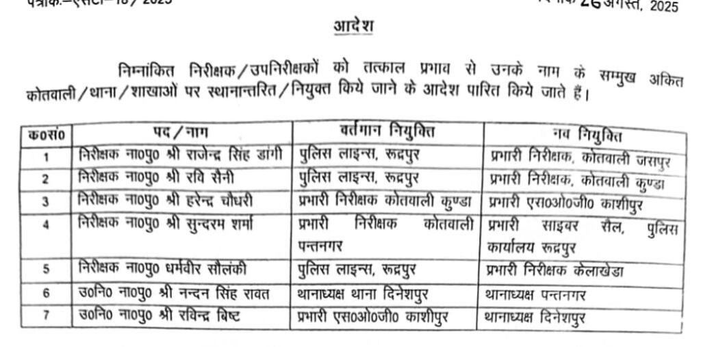 रवि सेनी को थाना कुंडा, रविंद्र बिस्ट को थाना दिनेशपुर तथा धर्मवीर सोलंकी को थान किलाखेड़ा की मिली ज़िम्मेदारी