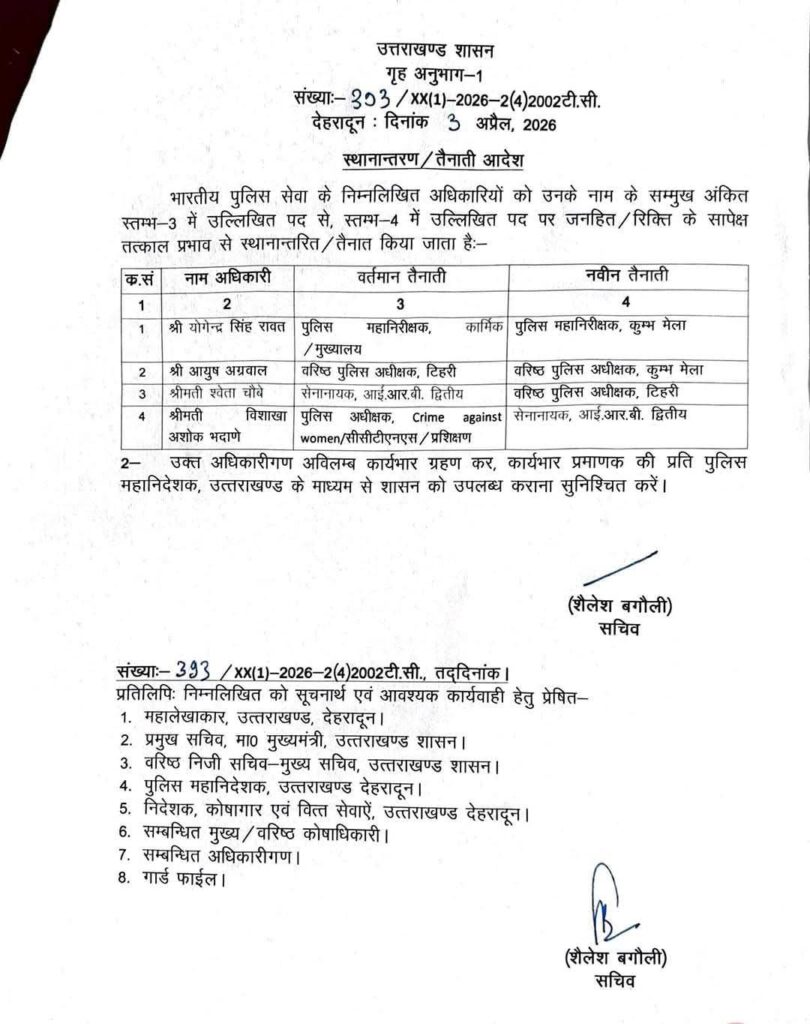 IPS अधिकारियों के हुए तबादले IPS Shweta Choubey बनी टिहरी की पुलिस कप्तान